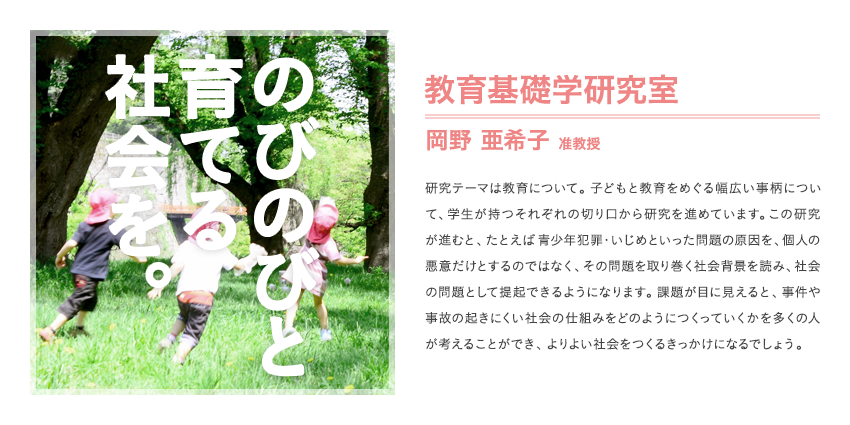 のびのびと 育てる 社会を。 教育基礎学研究室 岡野 亜希子 講師 研究テーマは教育について。子どもと教育をめぐる幅広い事柄について、学生が持つそれぞれの切り口から研究を進めています。この研究が進むと、たとえば青少年犯罪・いじめといった問題の原因を、個人の悪意だけとするのではなく、その問題を取り巻く社会背景を読み、社会の問題として提起できるようになります。課題が目に見えると、事件や事故の起きにくい社会の仕組みをどのようにつくっていくかを多くの人が考えることができ、よりよい社会をつくるきっかけになるでしょう。